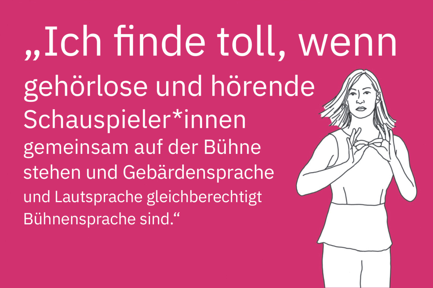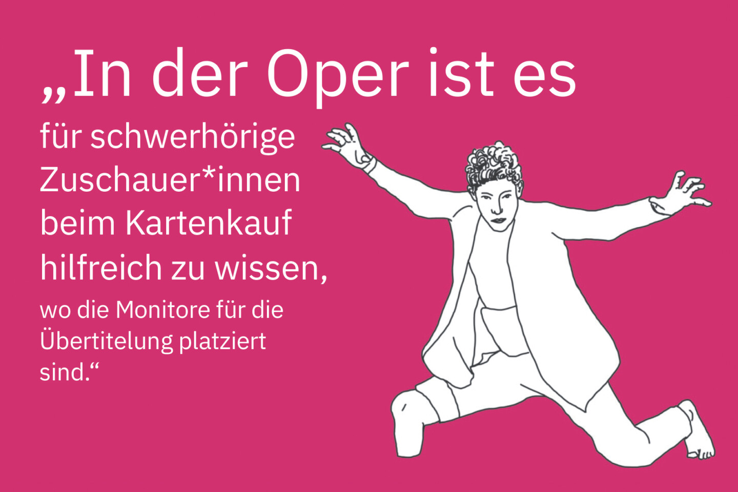 Die beschreibende Perspektive wird hingegen als ästhetisches Mittel in die dramaturgische Konzeption des Stücks einbezogen und ist für alle im Publikum hörbar. Ausgehend von der Perspektive gehörloser Gebärdensprach-Nutzer*innen wird zum Beispiel Gebärdensprache gleichberechtigt zur Lautsprache als Bühnensprache eingesetzt. Für die Perspektive der Merkmalgruppe der schwerhörigen Theaterbesucher*innen werden die Untertitel nicht über dem Bühnenbild angebracht, sondern in die Bühnenarchitektur integriert. Die Möglichkeiten der ästhetischen Ansätze sind so vielgestaltig wie das künstlerische Schaffen insgesamt. Wichtig ist, bei der Konzeption von Kulturproduktionen mit Menschen der betreffenden Merkmalgruppen zusammen zu arbeiten bzw. entsprechende künstlerische Akteur*innen zu beauftragen.